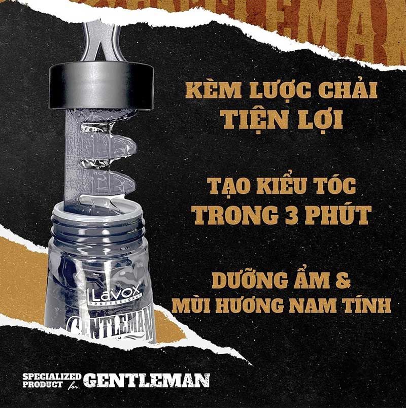 Bạn hữu mới mỗi ngày cho những kiểu tóc nhẹ nhàng, tự nhiên – Gel vuốt tóc tạo kiểu mềm Lavox Gentleman. Với độ giữ nếp vừa phải, công thức khô nhanh và không để lại vệt trắng, kết hợp cùng thành phần có khả năng dưỡng ẩm cho tóc, sản phẩm sẽ giúp chàng tự tin sở hữu được kiểu tóc như ý mà cảm giác lại vô cùng thoải mái, dễ chịu. Đặc biệt, sản phẩm có tích hợp lược chải tóc, giúp bạn tạo kiểu thật tiện lợi.